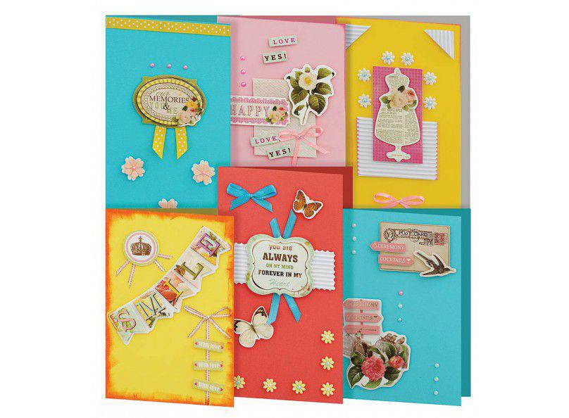 В набор входит: 6 заготовок для открыток, 6 конвертов, клеевые подушечки, декоративные элементы (вырубка из картона, ленты, паетки, стразы, полубусины)