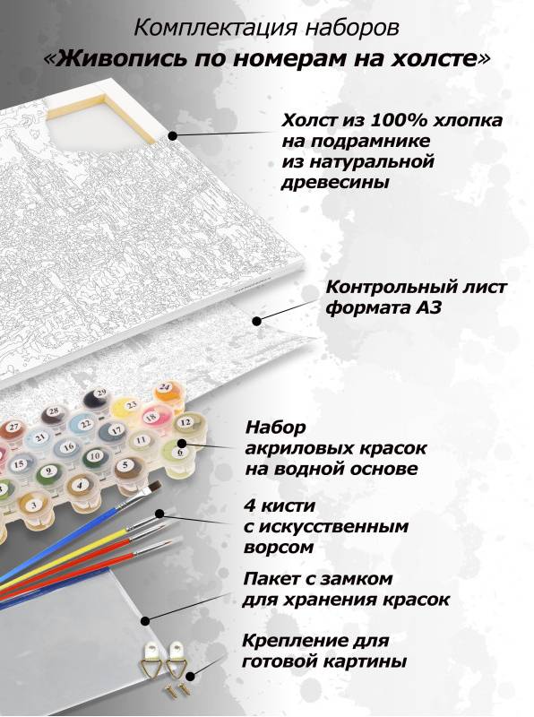 Оформление (аксессуары): В набор входит: холст на подрамнике, кисти, набор красок. Рамка в комплект НЕ входит.