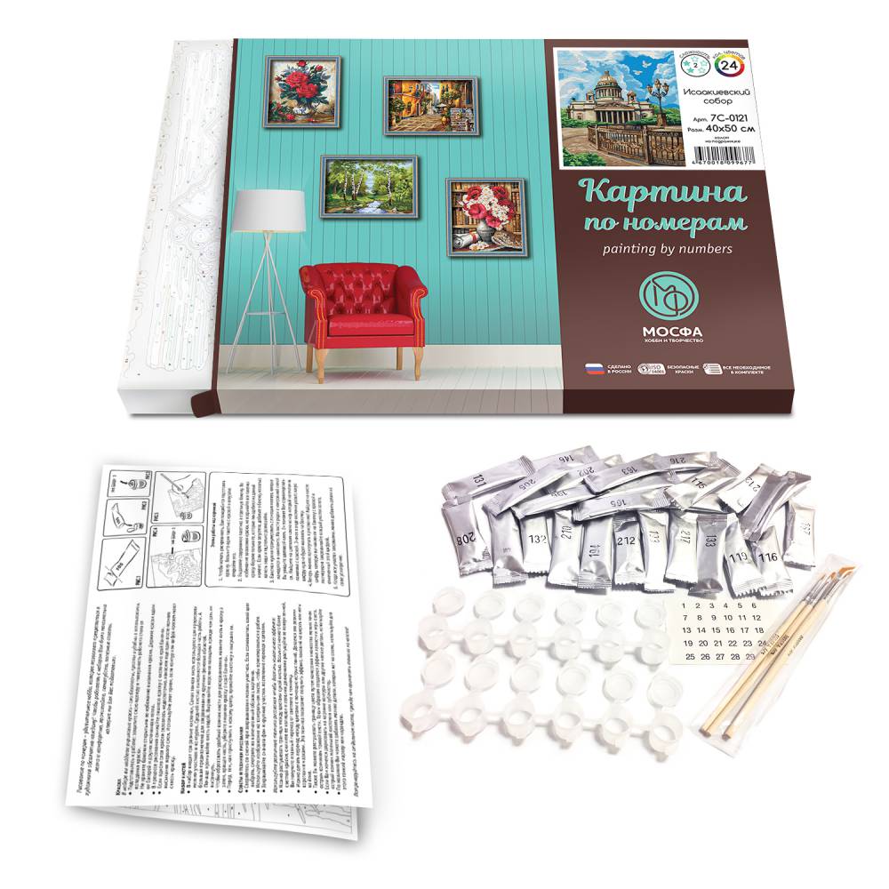 В комплект входит: подрамник, холст с нанесенными контурами рисунка и с указанием номеров красок (эскиз рисунка), высококачественные акриловые краски (не токсичные), кисточки, инструкция на русском языке.
