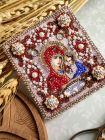 В набор входит: 2 искусственных холста с нанесенной схемой (сторона с ликом для вышивания и молитва для обратной стороны), бусины (Шамбала), ювелирные хрустальные бусины, ювелирный бисер (Япония), бисер (MILL HILL), бисер (Чехия), винтажные звездочки, стразы на нити, металлическая тесьма, трунцал, канитель.