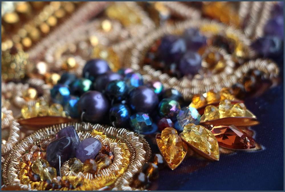 В набор входит: плотная атласная ткань с нанесенной авторской схемой, фетр с нанесенной авторской схемой, аметист, бусины “Майерика”, бусины “Хрусталь”, акрил (цвет бензин), стразы, стразовые цепочки, винтажные звездочки, металлическая фурнитура, металлическая тесьма с шариками, пайетки, ювелирный бисер ТОХО (Япония), бисер Чехия, бисер MILL HILL, трунцал, канитель, игла, карты расположения бусин и трунцала, пошаговая инструкция по пришиванию некоторых элементов с фотографиями.