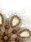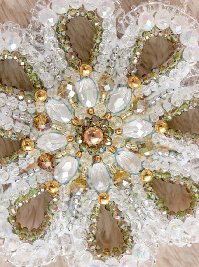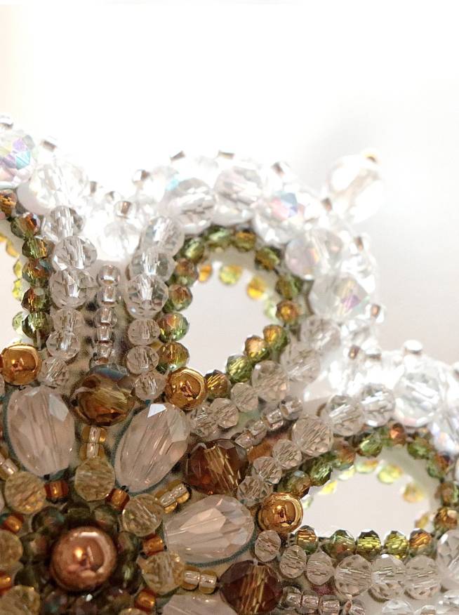 В набор входит: фетр с нанесенной авторской схемой, бусины “Хрусталь”, бисер (Чехия), металлические шарики, металлические штифты, цепочка, игла, картон, 2-х сторонний скотч, схема расположения бусин, инструкция.