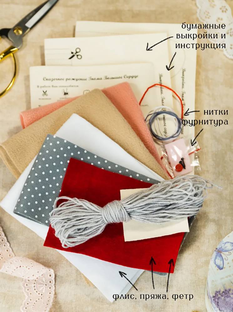 В набор входит: флис, фетр, пряжа, фурнитура, листы с выкройками персонажа, инструкция. Дополнительно вам потребуется синтепон или синтепух, в комплекте их нет.