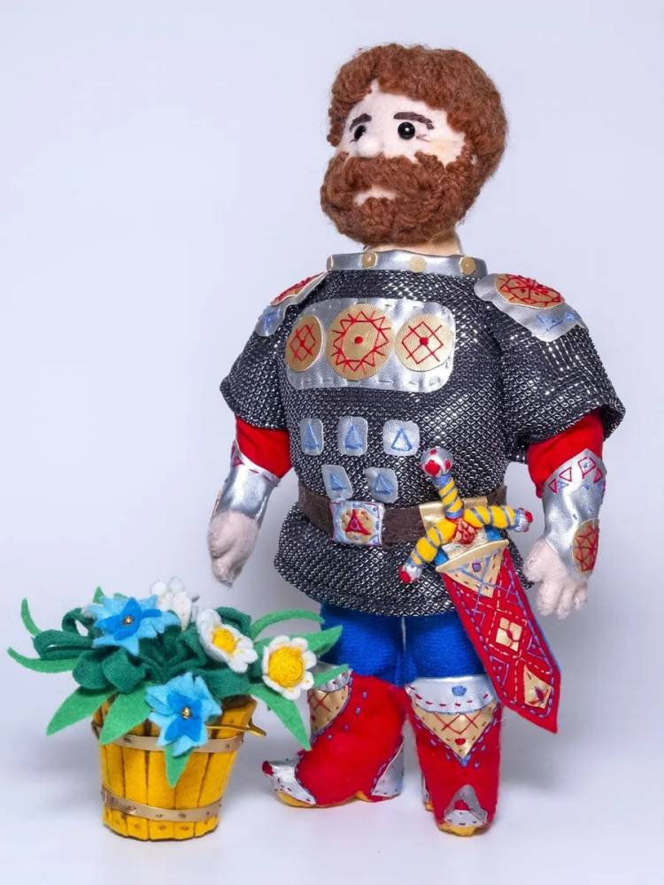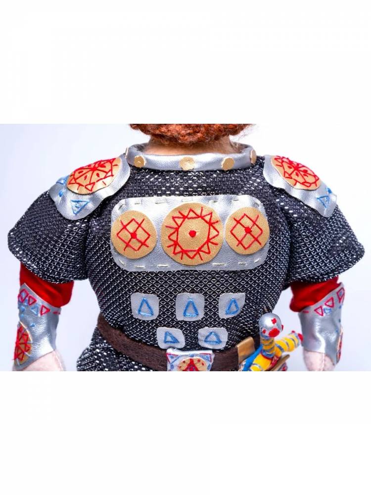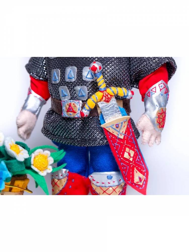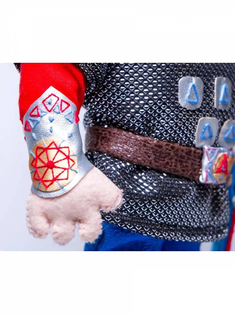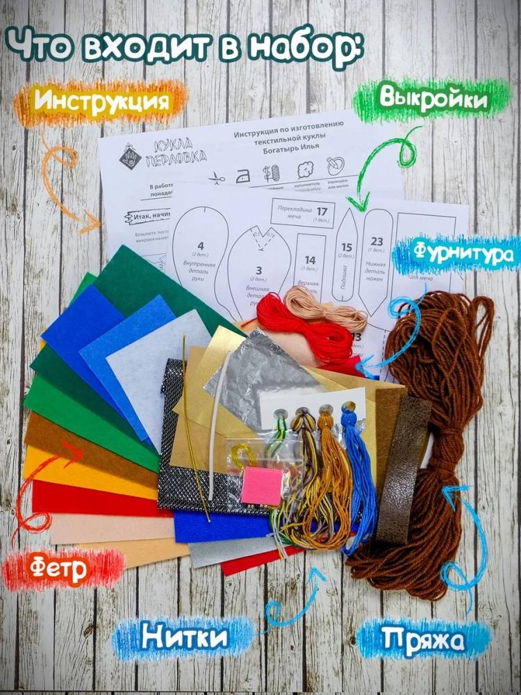 В набор входит: ткань для кольчуги, искусственная кожа, фетр различных расцветок, пряжа для бороды и волос, нитки мулине, картон, металлизированная нить, глаза-полусферы, бусинки, проволока, листы с выкройками персонажа (масштаб 1:1), инструкция. Дополнительно вам потребуется синтепон или синтепух, в комплекте их нет.