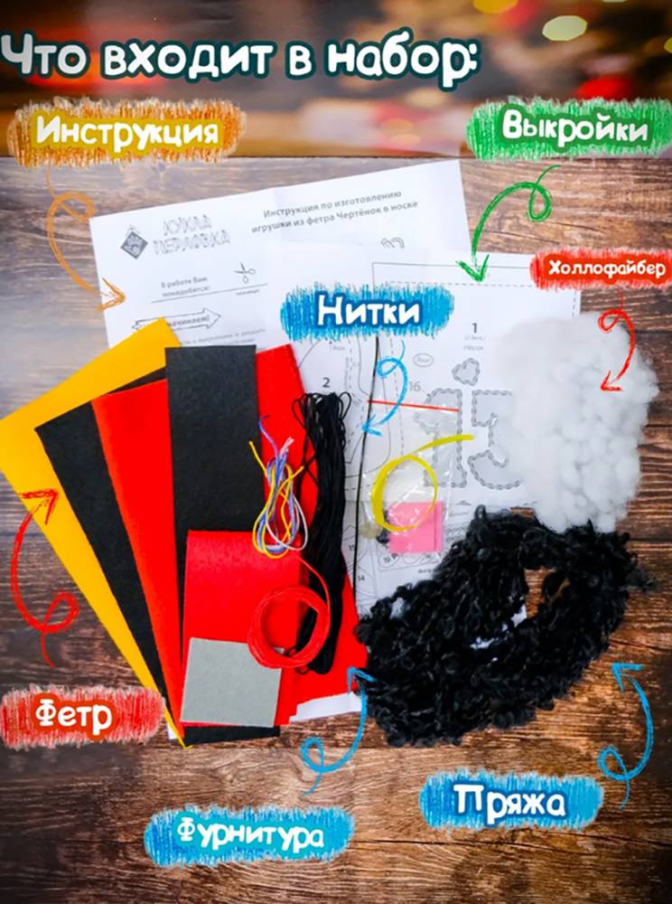 В набор входит: фетр, ткань, пряжа, мулине, фурнитура, синтепух, выкройки и инструкция.